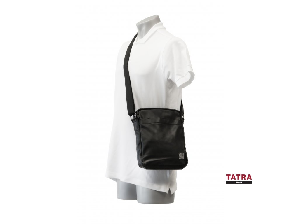 Black leatherette bag size A4. There is a metal TATRA logo in the corner of the bag.