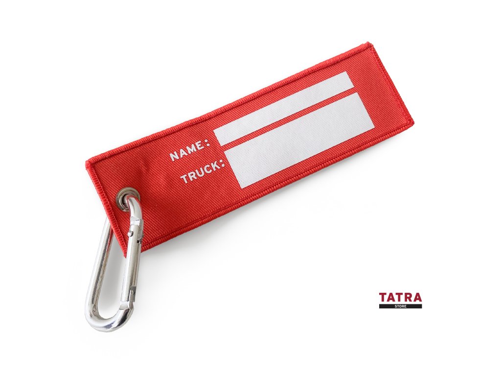 Látková klíčenka v červené barvě, kdy z jedné strany je nápis TATRA, z druhé se nachází vyobrazení aut. 7,5 cm x 3,5 cm