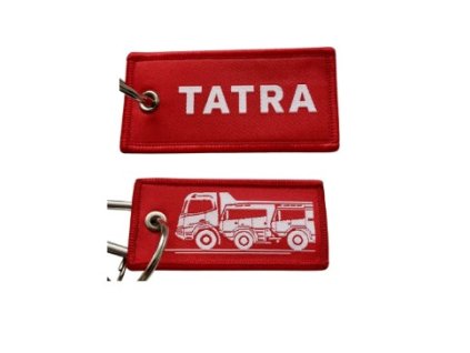 Látková klíčenka v červené barvě, kdy z jedné strany je nápis TATRA, z druhé se nachází vyobrazení aut. 7,5 cm x 3,5 cm