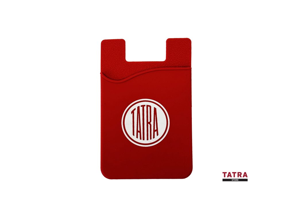 Látková klíčenka v červené barvě, kdy z jedné strany je nápis TATRA, z druhé se nachází vyobrazení aut. 7,5 cm x 3,5 cm