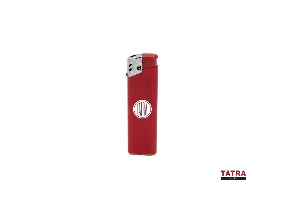 Látková klíčenka v červené barvě, kdy z jedné strany je nápis TATRA, z druhé se nachází vyobrazení aut. 7,5 cm x 3,5 cm
