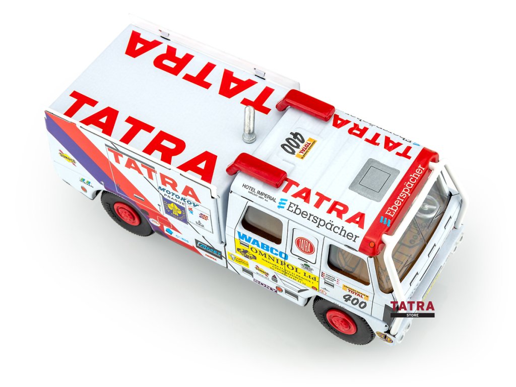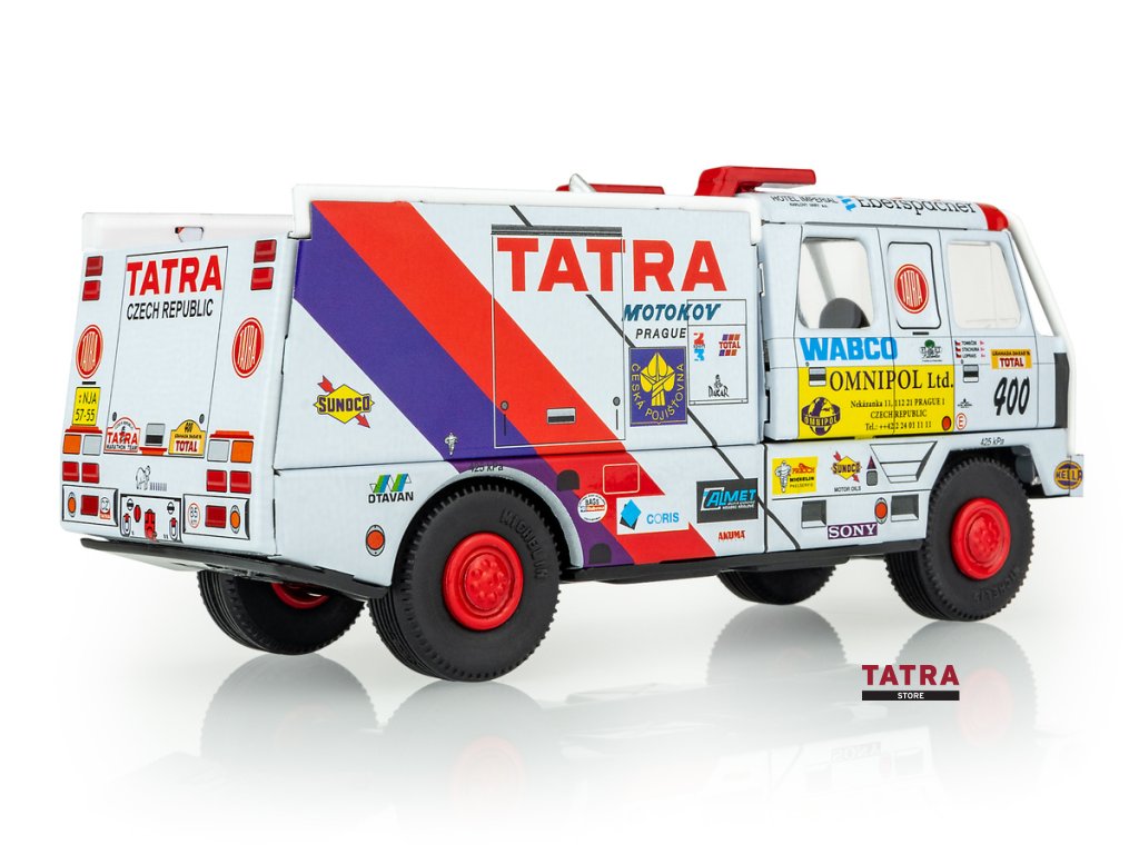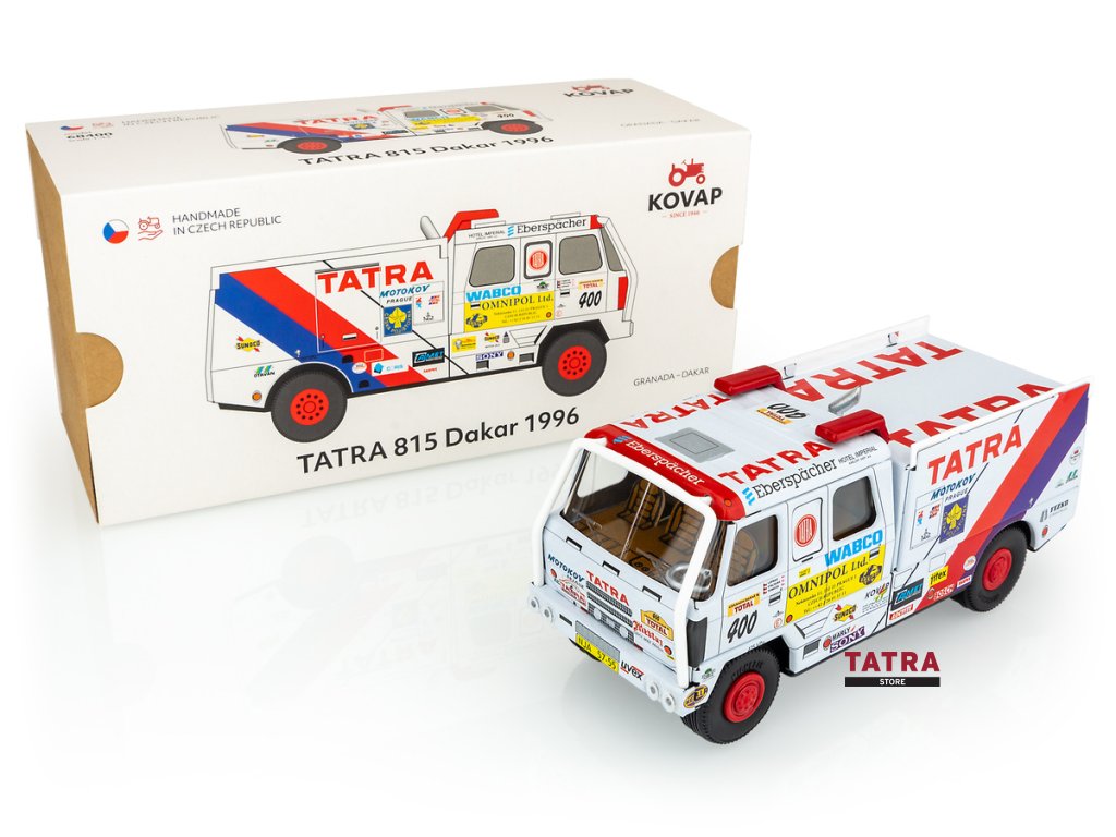 Plechový model TATRA T 815, který startoval v roce 1996 na slavné Rallye Dakar. Trasa vedla z Granady do Dakaru a pro značku TATRA šlo o jubilejní desátý start v této soutěži. Posádku vozidla s číslem 400 tvořila trojice: Loprais, Stachura a Tomeček. Ostřílená sestava si vedla skvěle a na technických pasážích dotahovala rychlejší vozidla značky Kamaz. Bohužel v tomto ročníku panovaly zmatky v řadách pořadatelů, kteří v průběhu soutěže změnili trasu. Tento zásah poškodil právě vozidlo Karla Lopraise a závodníci se tak museli spokojit s druhým místem.